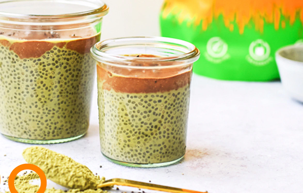 Questa chiapudding con tè verde giapponese (matcha) e una copertura di cioccolato è il miglior cibo salutare per iniziare la tua giornata.