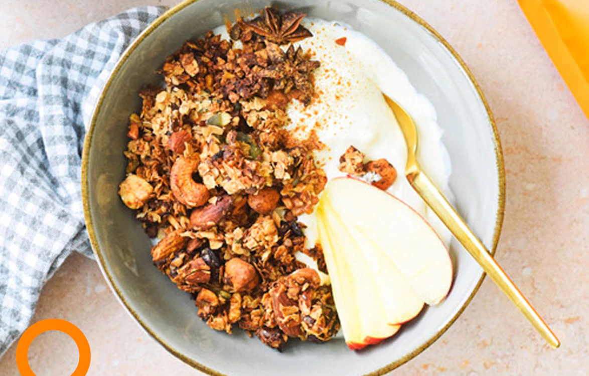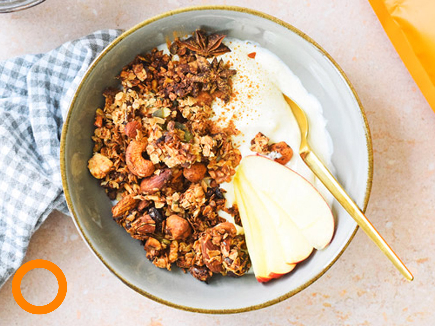 Questa granola, ricca di fibre e grassi salutari da noci e semi, è una festa per la tua digestione. L'abbiamo resa irresistibile con le spezie per biscotti speculaas, il tutto su un letto di yogurt al cocco. Sarà un piacere duraturo!