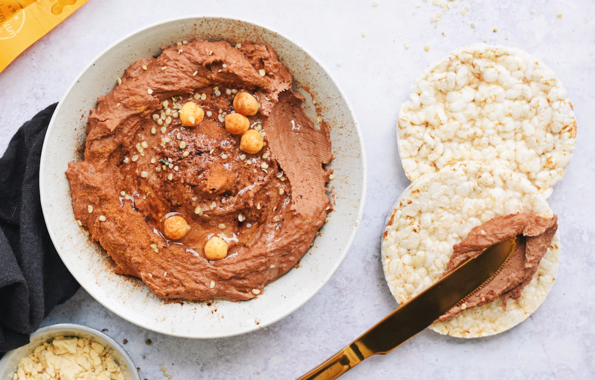 Questa hummus al cioccolato ricca di proteine è così deliziosa che segretamente la spalmeremmo volentieri su ogni fetta di pane, cracker o fette di riso. Uno snack delizioso e ricco di proteine da gustare tra un pasto e l'altro, e anche ideale come condimento per il pane nella lunchbox dei tuoi bambini.