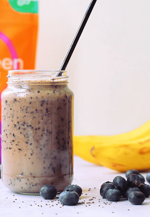 - Vuoi utilizzare il frullato per avere più energia? Aggiungi un po' di fiocchi d'avena. Questo rende il frullato di mirtilli blu con la polvere di collagene perfetto anche come colazione!