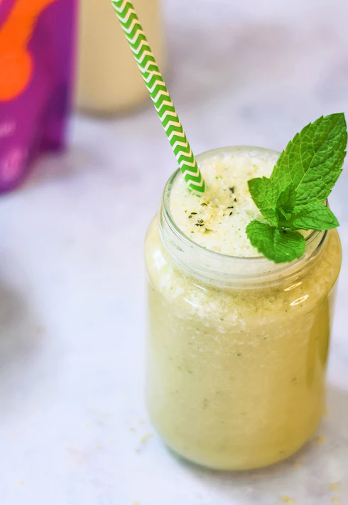 - Aggiungi il melone insieme alla menta, al Collagene Booster, alla banana e all'acqua in un frullatore e mescola ad alta velocità fino a ottenere una consistenza liscia.