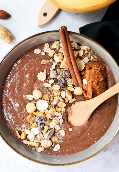 È ora di condividere questa deliziosa bowl proteica al cioccolato con te! È davvero una festa per il palato. Ideale per la colazione, ma anche come pasto energetico prima o dopo l'allenamento. Un altro vantaggio? È facilissima da preparare e puoi variare all'infinito con i topping.