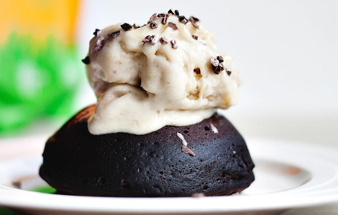 Deliziosa mugcake con gelato alla banana e 15 grammi di proteine per pezzo. Incredibilmente gustoso e al 100% vegetale!